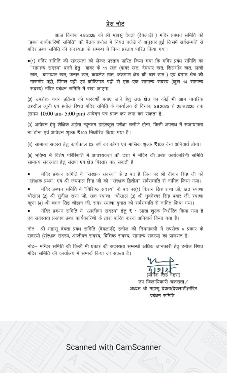 ज्ञापन में कहा गया कि समिति का विस्तार केवल बावर क्षेत्र की 11 खतों एवं बंगाण क्षेत्र की 3 पट्टियों तक सीमित किया गया है और आजीवन सदस्यता शुल्क ₹ एक लाख तय किया गया है। जबकि श्री महासू देवता की मान्यता सम्पूर्ण जौनसार-बावर की 39 खतों, बंगाण, फतेह पर्वत, रंवाई-जौनपुर, यमुना घाटी सहित हिमाचल प्रदेश के सिरमौर व शिमला जिलों तक फैली हुई है। परंपरागत रूप से मंदिर समिति में हक-हकूकधारी और कारिंदों पुजारी, बजीर, राजगुरु, ठाणी-भंडारी, बाजगी, पिशनारे और सदर स्याणा को शामिल किया जाता रहा है।