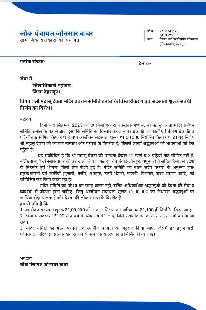 देहरादून। श्री महासू देवता मंदिर प्रबंधन समिति हनोल के विस्तारीकरण एवं सदस्यता शुल्क से जुड़े निर्णय का सामाजिक सरोकारों को समर्पित लोक पंचायत, जौनसार-बावर ने विरोध किया है। संगठन ने जिलाधिकारी कार्यालय देहरादून को ज्ञापन सौंपकर समिति के फैसले को परंपरा और मान्यता के विपरीत बताया।